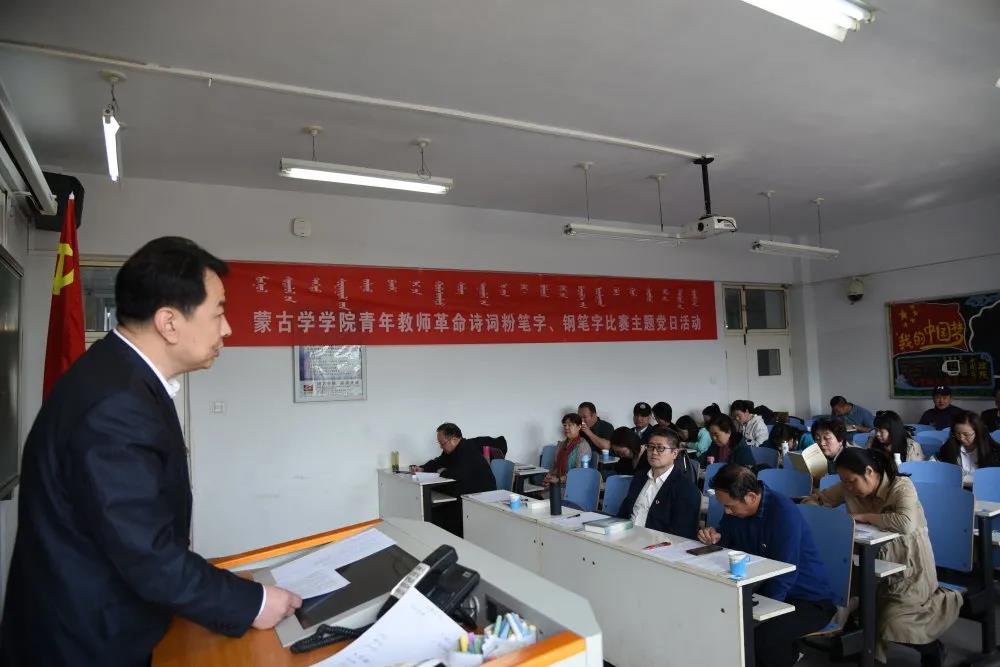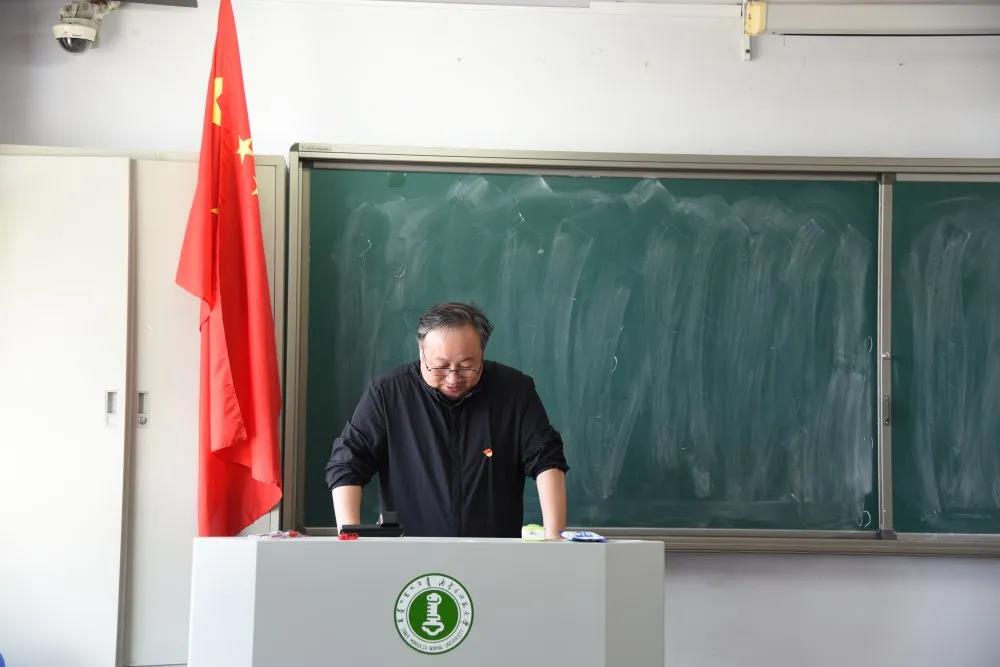 冠军获得者赵福财代表获奖青年教师发表了参赛感言。除此之外,额尔敦陶格陶副教授带领全体党员朗诵了毛泽东《七律·长征》,以此感悟共产党人的初心和使命。